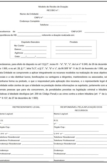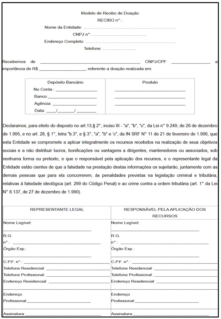 Para fazer uso da dedução, as doações, quando em dinheiro, devem ser feitas por depósito bancário diretamente em conta em nome da entidade beneficiária e as pessoas jurídicas doadoras deverão arquivar o recibo do depósito bancário. Neste caso, a organização que receber a doação deverá fornecer à doadora uma declaração no modelo da Instrução Normativa 87/96 da Secretaria da Receita Federal (ver modelo no final deste capítulo).